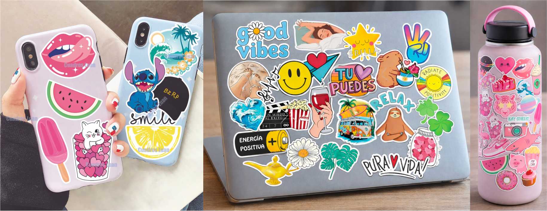 Personaliza todos tus objetos con onda. Perfectos para botellas, termos, compus, tablets, celulares, cuadernos y carpetas.